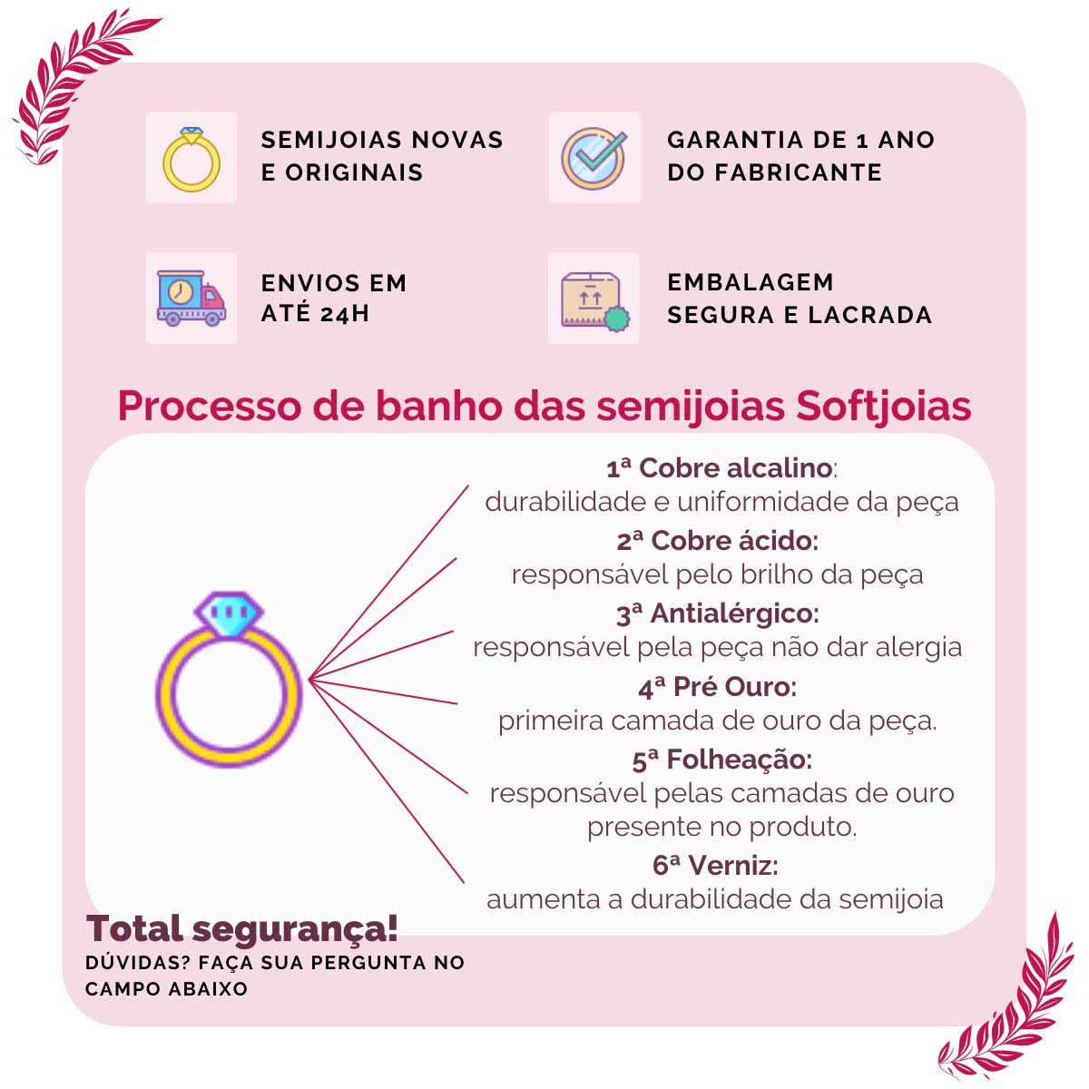 As semijoias da Softjoias são banhadas em ouro, ouro rosé, ródio branco, ródio negro e grafite. Também trabalhamos com prata 925 legítima, com garantia vitalícia. Além disso, utilizamos latão livre de níquel, com banho antialérgico e acabamento com verniz suíço.