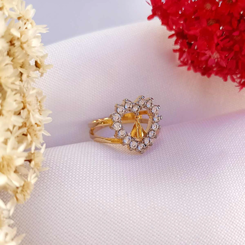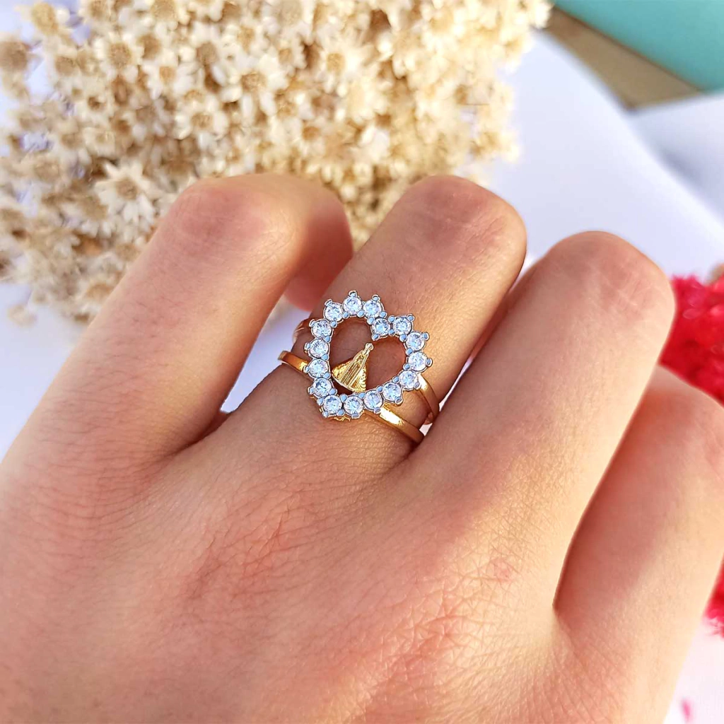 O anel nossa senhora com coração de zircônias é ideal para ser usado desde os eventos mais importantes como também nos mais simples. Uma peça rica em detalhes. Em seu centro encontra-se uma Nossa Senhora com um arco de coração cheio de zircônias e em suas duas extremidades, seu aro se abre e se torna duplo.