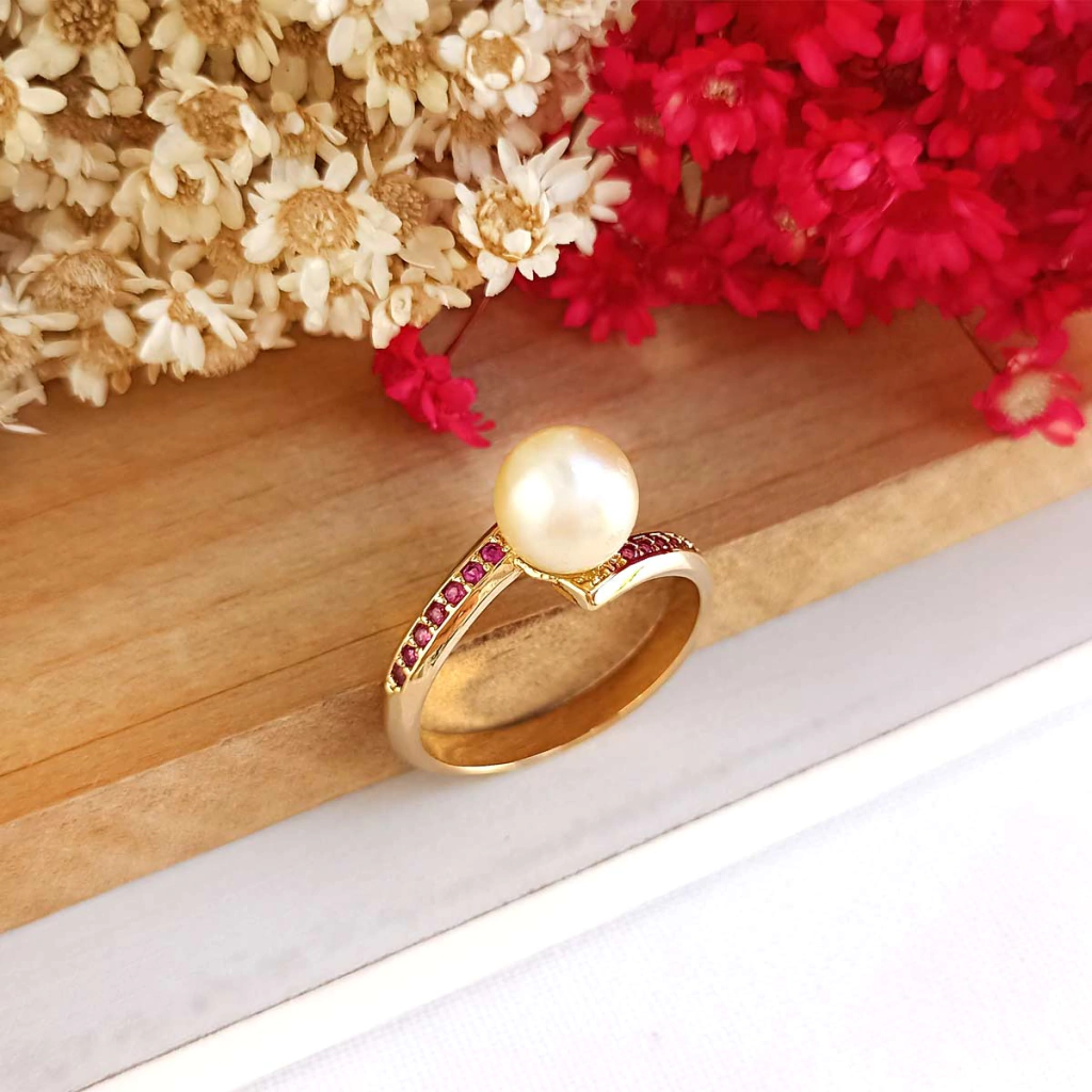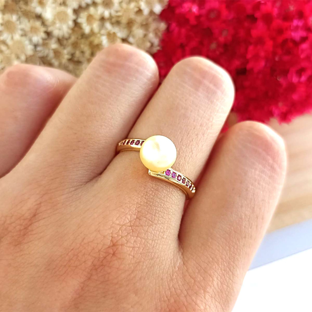 Não da para cansar de dizer o quanto a pérola é uma gema perfeita! Trata-se afinal de um elemento realmente raro e valioso na natureza. Por isso o anel de pérola com zircônias rosas é encantador! Seu aro folheado em ouro 18K tem pequenas zircônias rosa cravejadas e uma linda pérola no topo presa em uma técnica impressionante que deixa a peça ainda mais delicada.