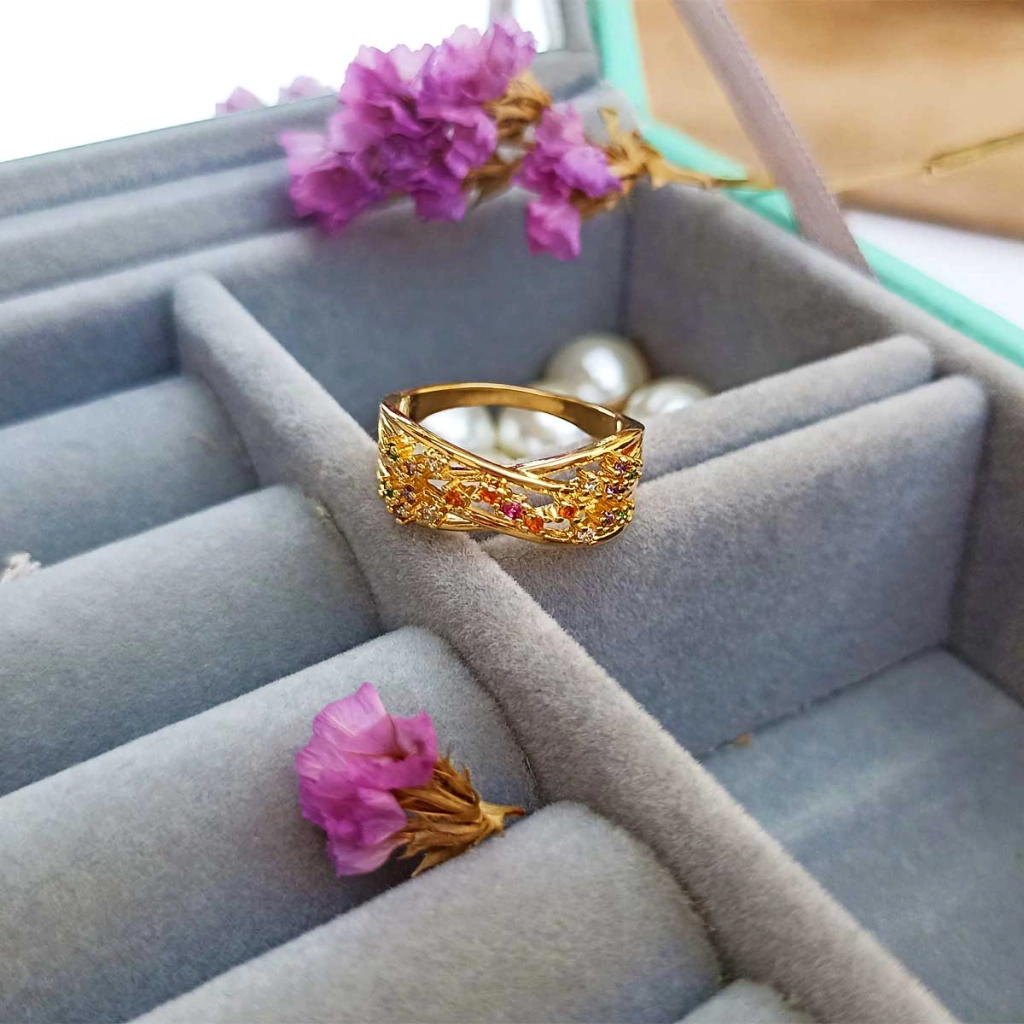 - Material: Metal banhado a ouro e zircônias coloridas |