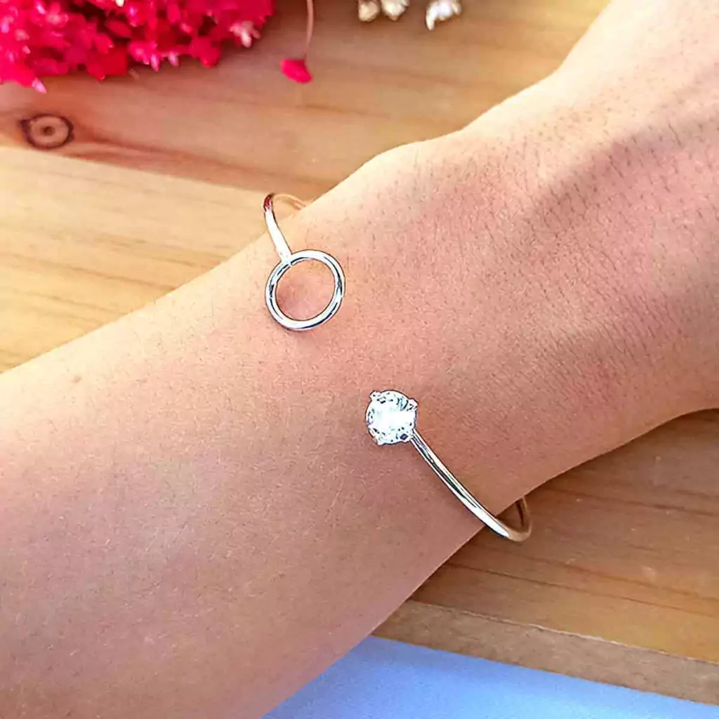 Bracelete Regulável de Círculo e Cristal Prata 925, Uma linda jóia que possui um Círculo vazado em uma ponta e na outra um cristal também em formato de Círculo.