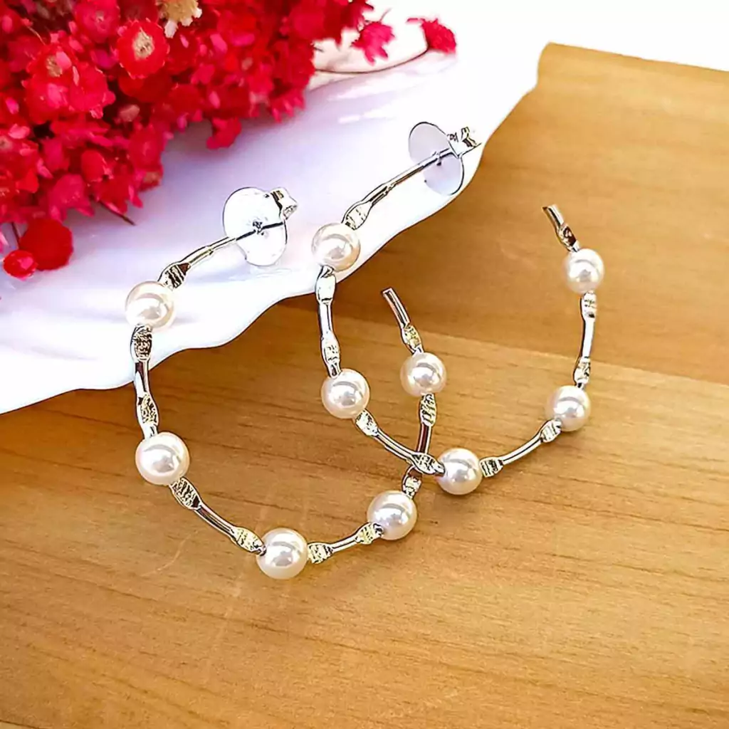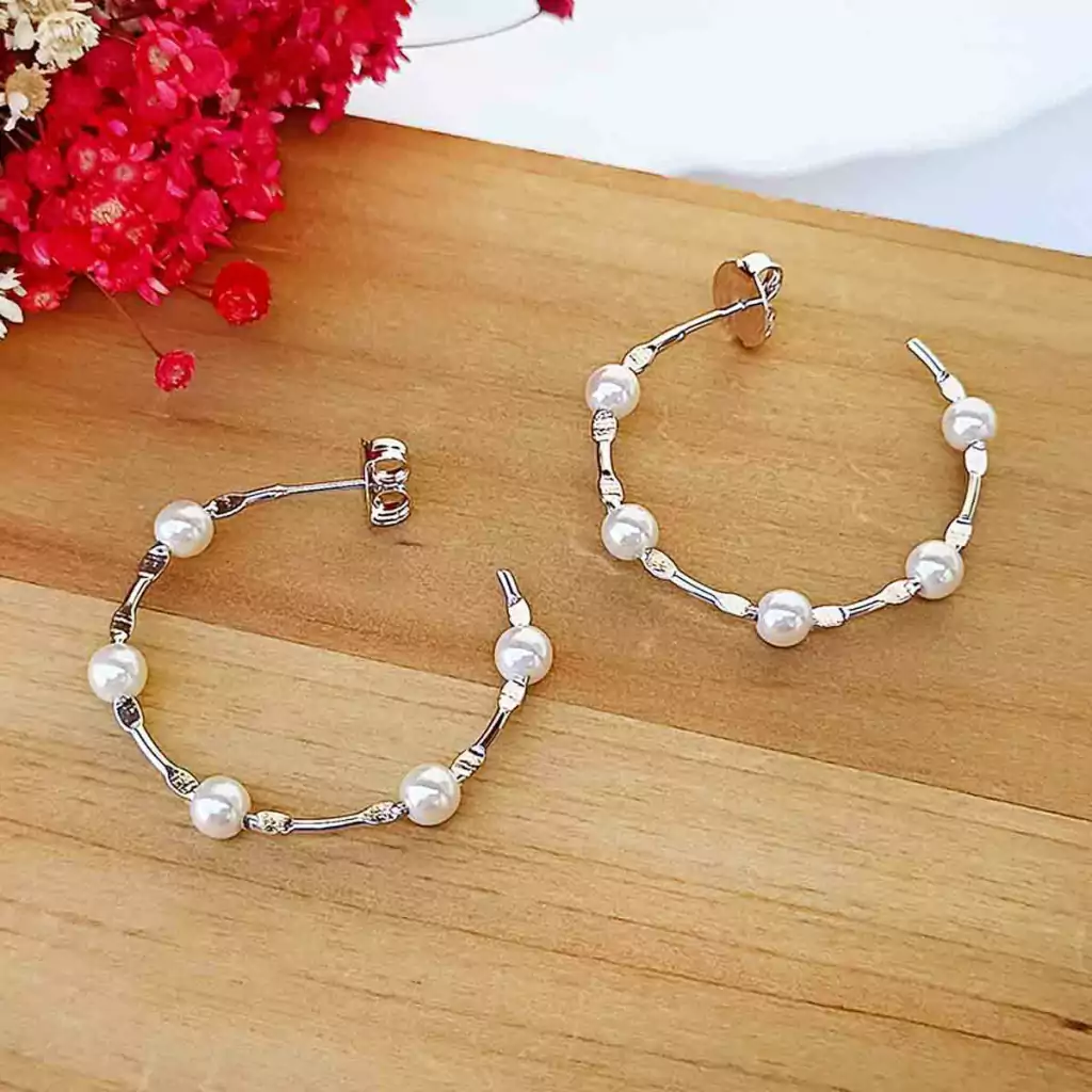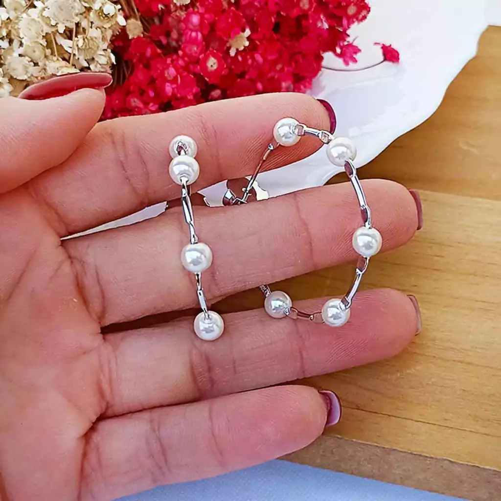Brinco Argola Aro Perolas Banhado Rodio Branco, esse produto é constituido de argola de fio com perolas fixadas intercaladas, com presilha de fecho tarraxa.