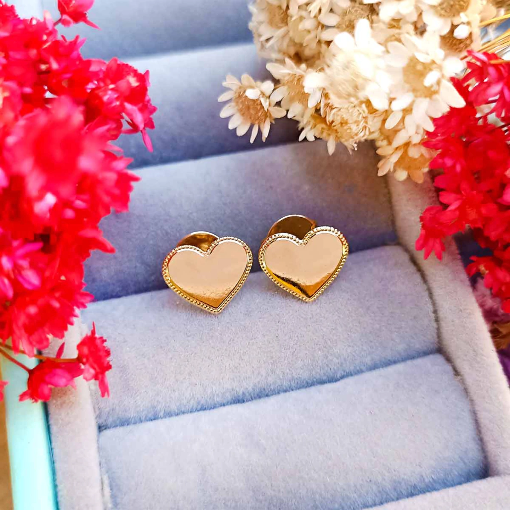 Esse brinco é super fofo, folheado a ouro, super discreto e delicado. Perfeito para as mulheres românticas, pois sua base é um coração chapeado com detalhes na borda. É aquela peça que todas devem ter, com apenas um acessório você pode combinar com vários estilos. Uma semijoia que é antialérgica e possui garantia de um ano!
