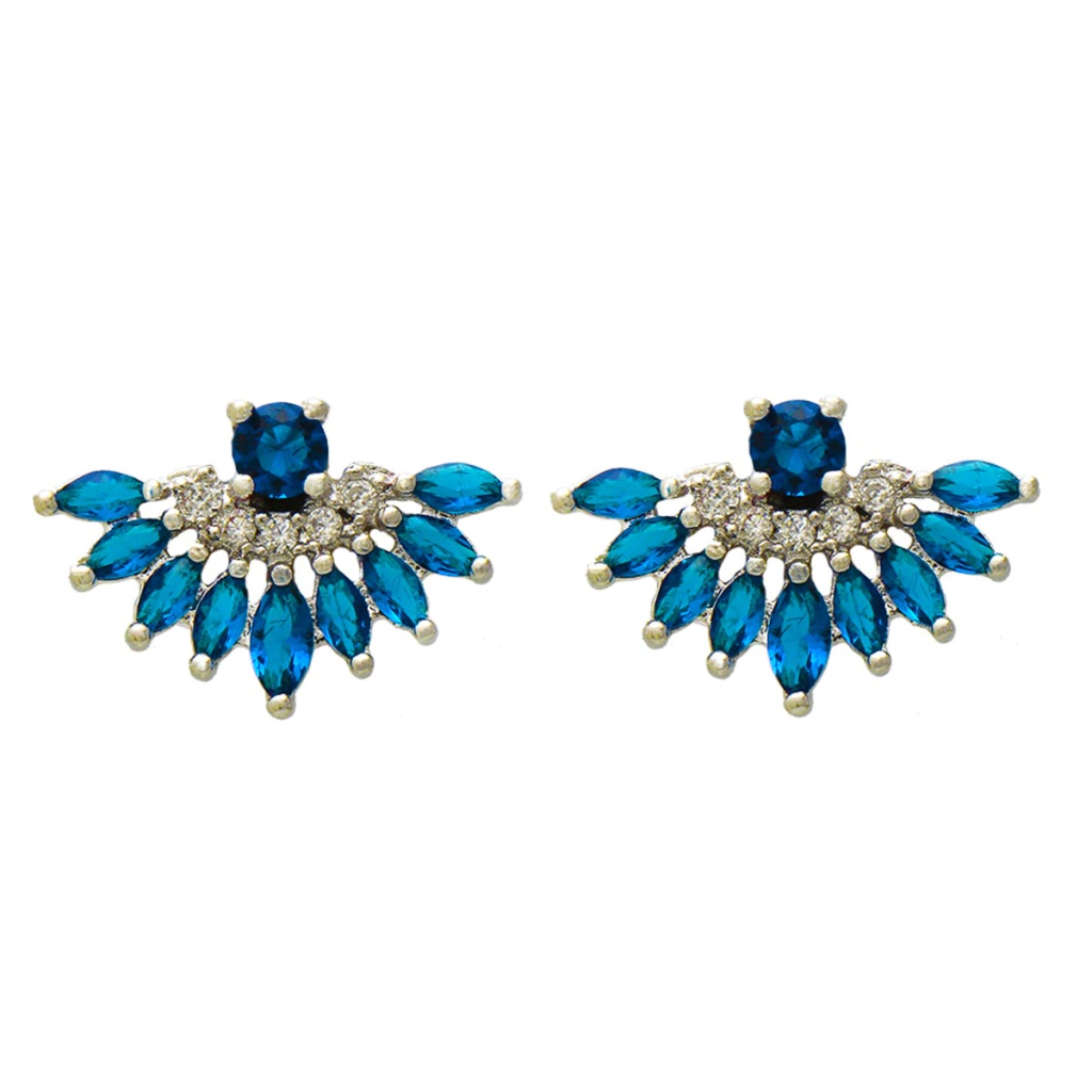 O brinco com formato de leque é pequeno, possui seus cristais na cor azul escuro e são intercalados com zircônias transparentes, folheado no ródio branco orna ainda mais com qualquer look. É um acessório que chama a atenção por si só, apresentando as pedrarias com cores mais frias é a peça chave para eventos com mais requinte, você vai ter combinações maravilhosas usando roupas que vão combinar com este adorno super moderno. Adquira seu par e fique maravilhosa!
