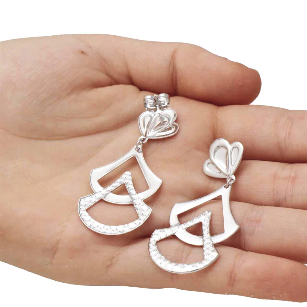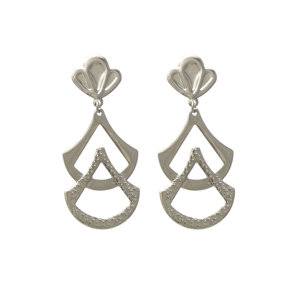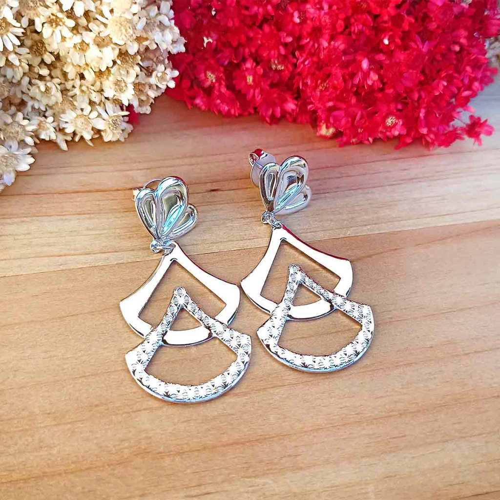 Este lindo brinco possui um pingente duplo vazado com a forma de um leque, sendo um deles é estampado com diversos triângulos pequeninos. Além de contar também com uma base desenhada em relevo. É uma peça exótica e muito bela com todo o brilho do banho em ródio branco. Adquira já seu par!