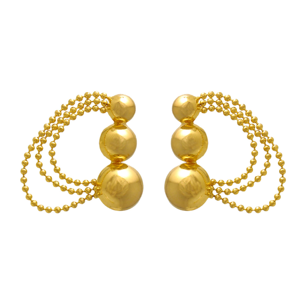 Esse brinco tem um brilho incrível! Folheado a ouro, possui três meias bolas em sua base e algumas correntinhas finas penduradas, que garantem um charme ainda maior à peça.