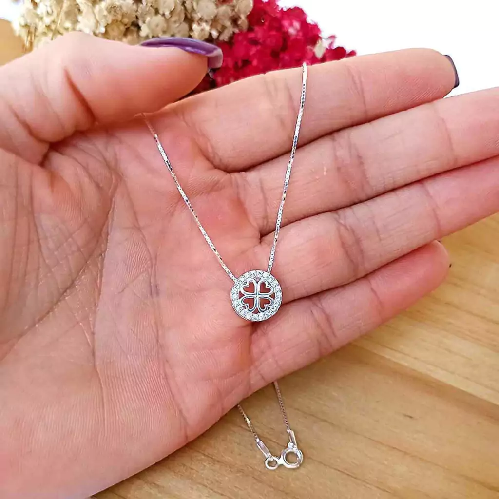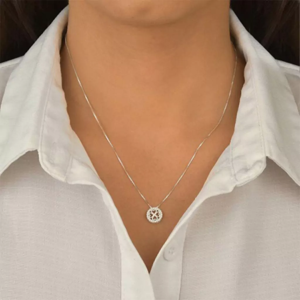 Colar Círculo Cravejado Trevo Vazado Prata 925, esse produto usa corrente de prata veneziana, vem com Pingente Passante Círculo Cravejado Trevo Vazado, que é composto por prata cravejado e liso em forma de círculo vazado com um trevo no centro;