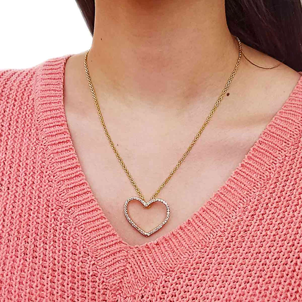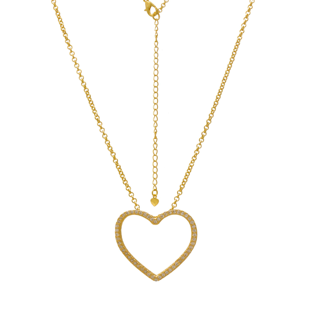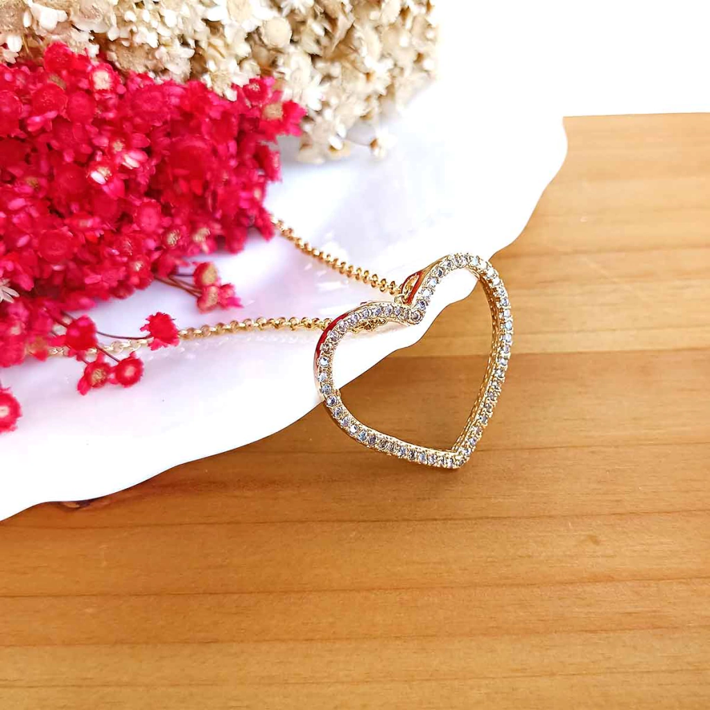 Este colar é simplesmente um arraso! Com seu grande coração vazado, cravejado de zircônias, ele é perfeito para você admiradora de joias que realçam o poder feminino. Pode ser usado em looks noturnos e é adequado em qualquer visual! Uma semijoia folheada, com garantia de um ano e antialérgica. Gostou? Peça já o seu!!