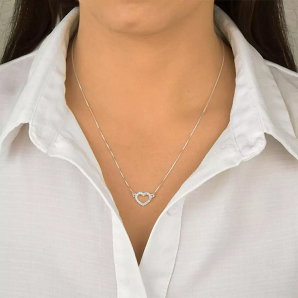Gargantilha Coração Vazado Cravejado de Prata 925, esse produto usa corrente de prata veneziana, vem com Pingente Coração Vazado Cravejado, que é composto por prata cravejada em forma de um coração vazio;