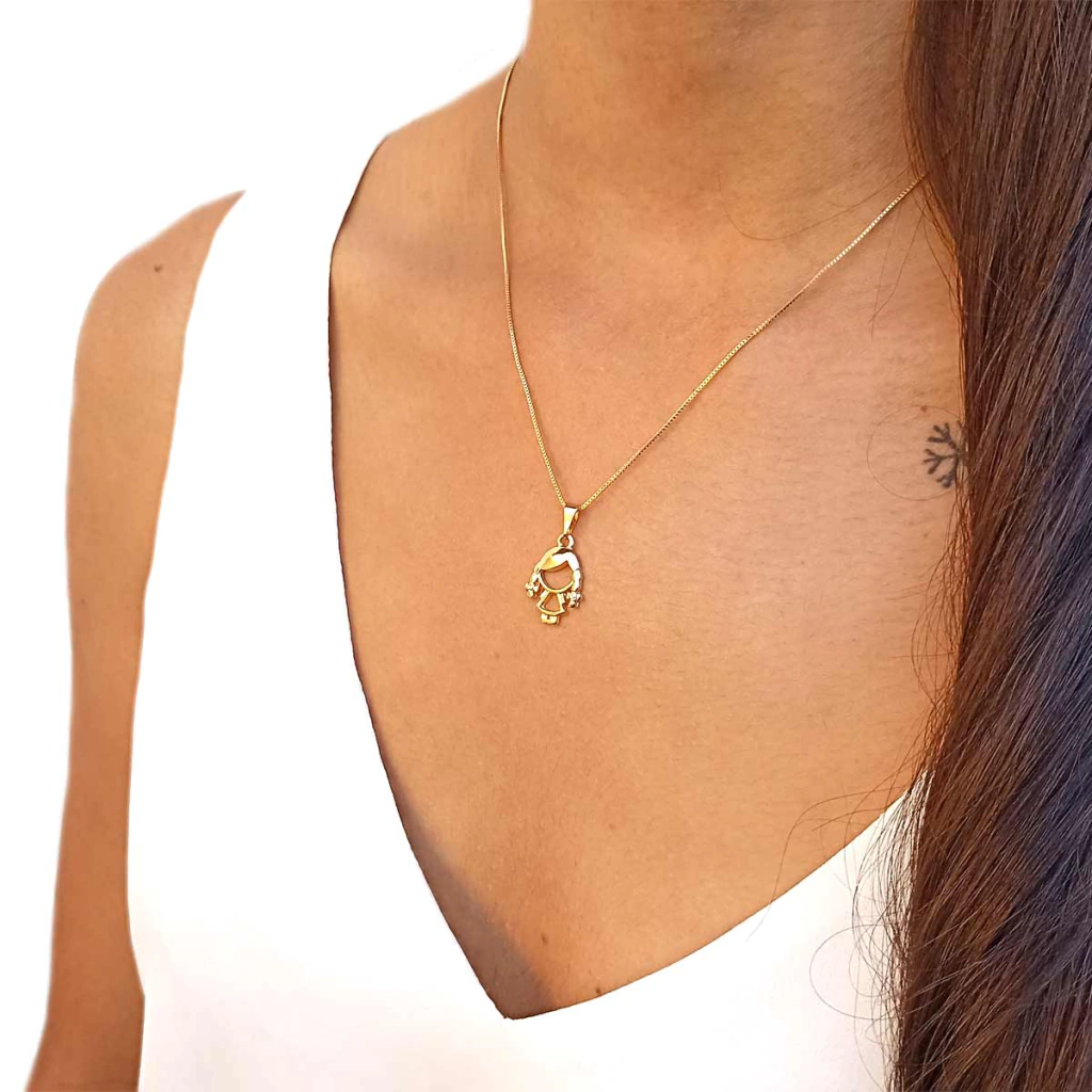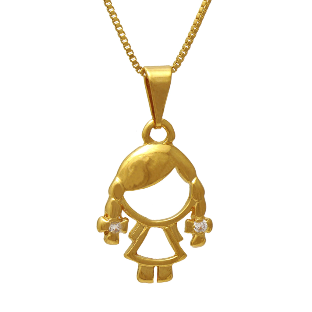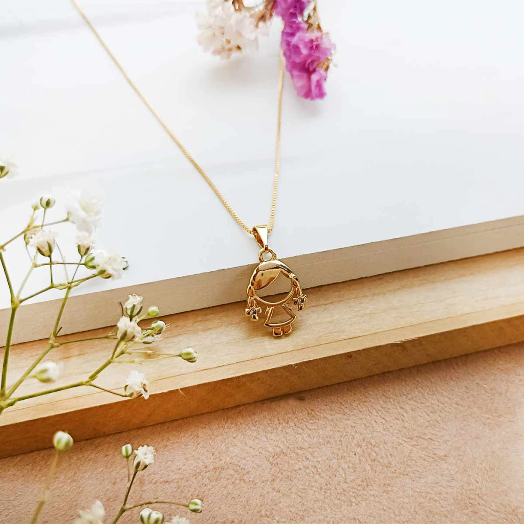 Esse colar é uma fofura! Seu pingente com espaços vazados dá os detalhezinhos do rosto e do vestido. Já o detalhe do cabelo é preenchido e possuí duas zircônias, uma em cada trança, como se prendessem as mechas. Uma gracinha! Sua corrente veneziana possui regulagem de cerca de 5cm que lhe permite fazer composição com outros acessórios.