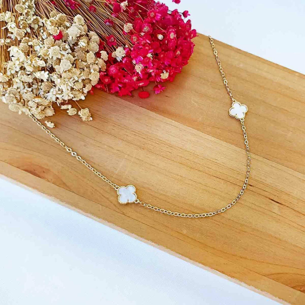 Colar De Trevo Branco Perolado Virginia Folheado em Ouro 18K