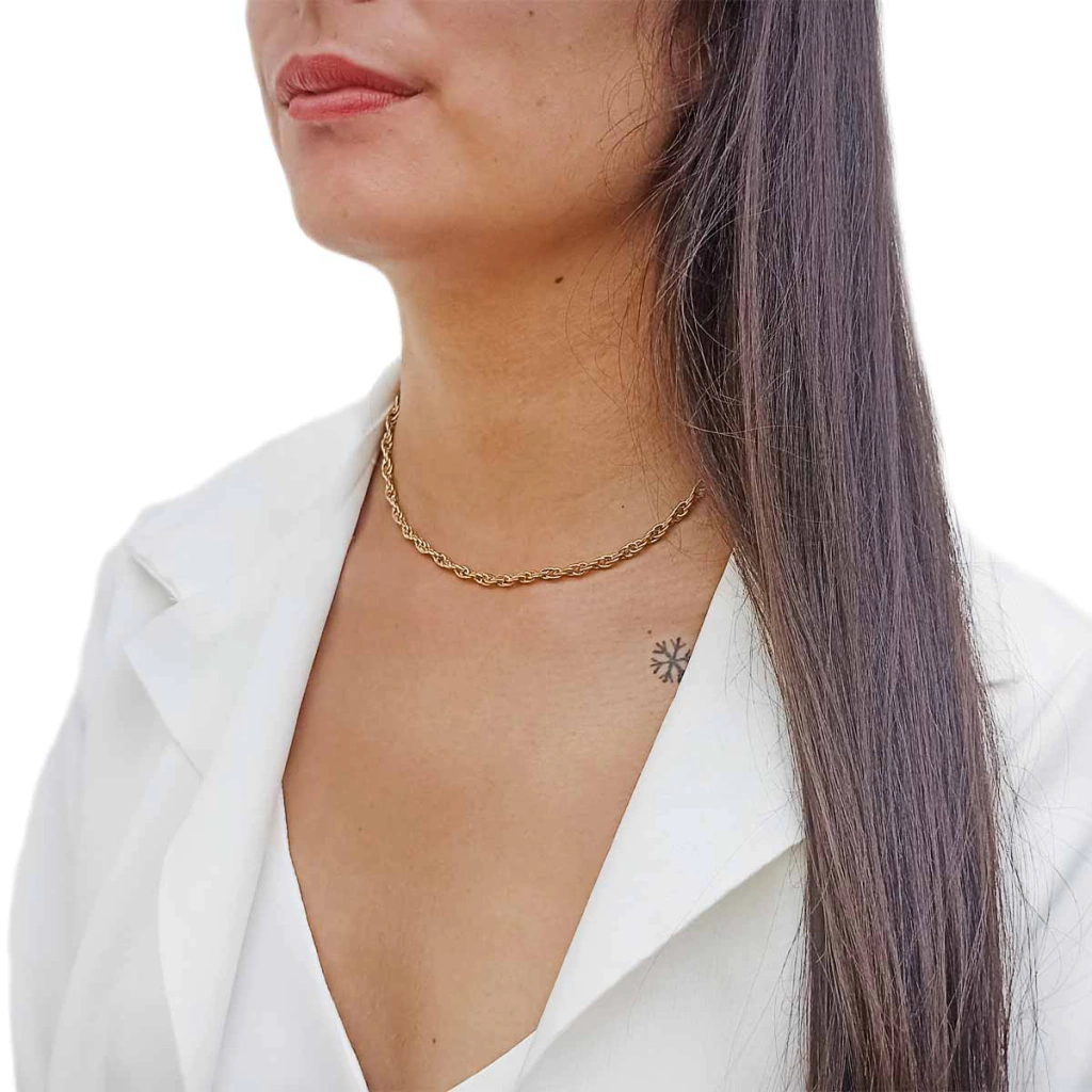 O colar dourado com pequenos elos trançados é completamente folheado em ouro, e é uma peça de peso! Como já deve saber as correntes vem garantindo produções incríveis e firmando o espaço no mundo da moda, pois transforma looks básicos, como também, completa os mais requintados.