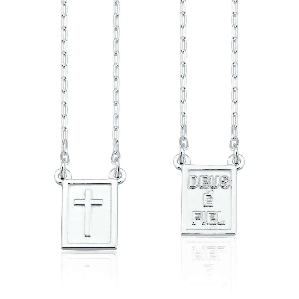 Colar Escapulário Deus é Fiel e Cruz Vazada Prata 925. Esse escapulário é perfeito para quem valoriza elegância e aprecia acessórios com significado. Com design delicado e cheio de detalhes com a frase "Deus é Fiel" , ele traz um toque especial ao seu visual, seja no dia a dia ou em momentos especiais.