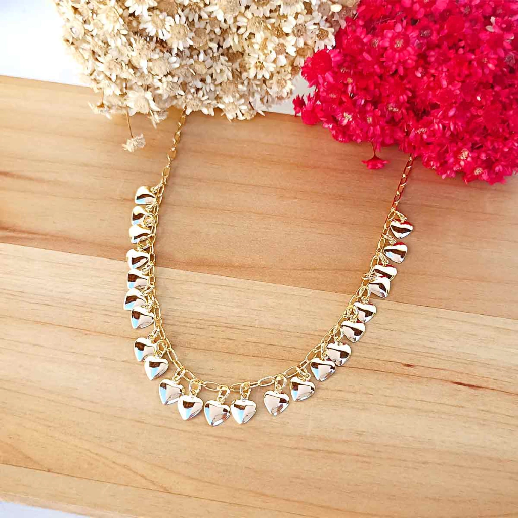 Uma moda a que muitas pessoas aderiram são os Chokers! Afinal são um acessório marcante e essencial para várias ocasiões! O Colar Gargantilha de Coração, possui diversos corações em chapinhas, e traz um ar alegre e descontraído ao seu visual. Um item encantador que você pode usar para fazer mix com outros colares, mais longos ou não, nas combinações mais lindas! Entre nessa moda também, e veja a diferença que um choker pode fazer em seu look!