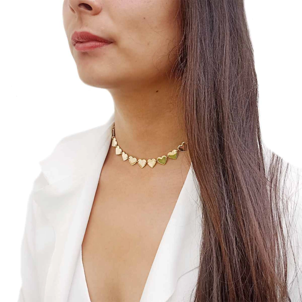 Coração, o símbolo do amor! Está presente em diversos acessórios pelos seus mais variados e belos significados assim como neste colar. Ele possui vários deles, mais precisamente uma fileira de onze corações folheados em ouro 18K que são arrematados por uma corrente grumet de elos pequenos alongados. É um mimo que traz graça e charme ao visual de qualquer mulher!