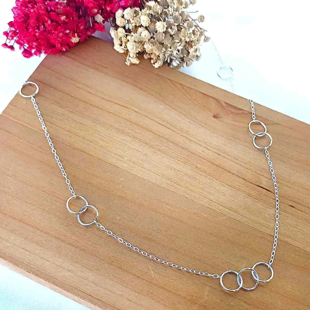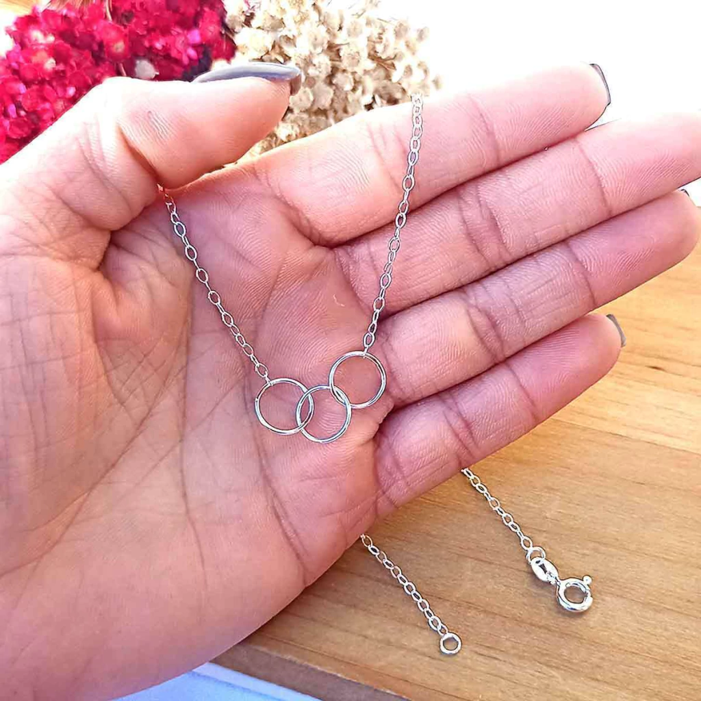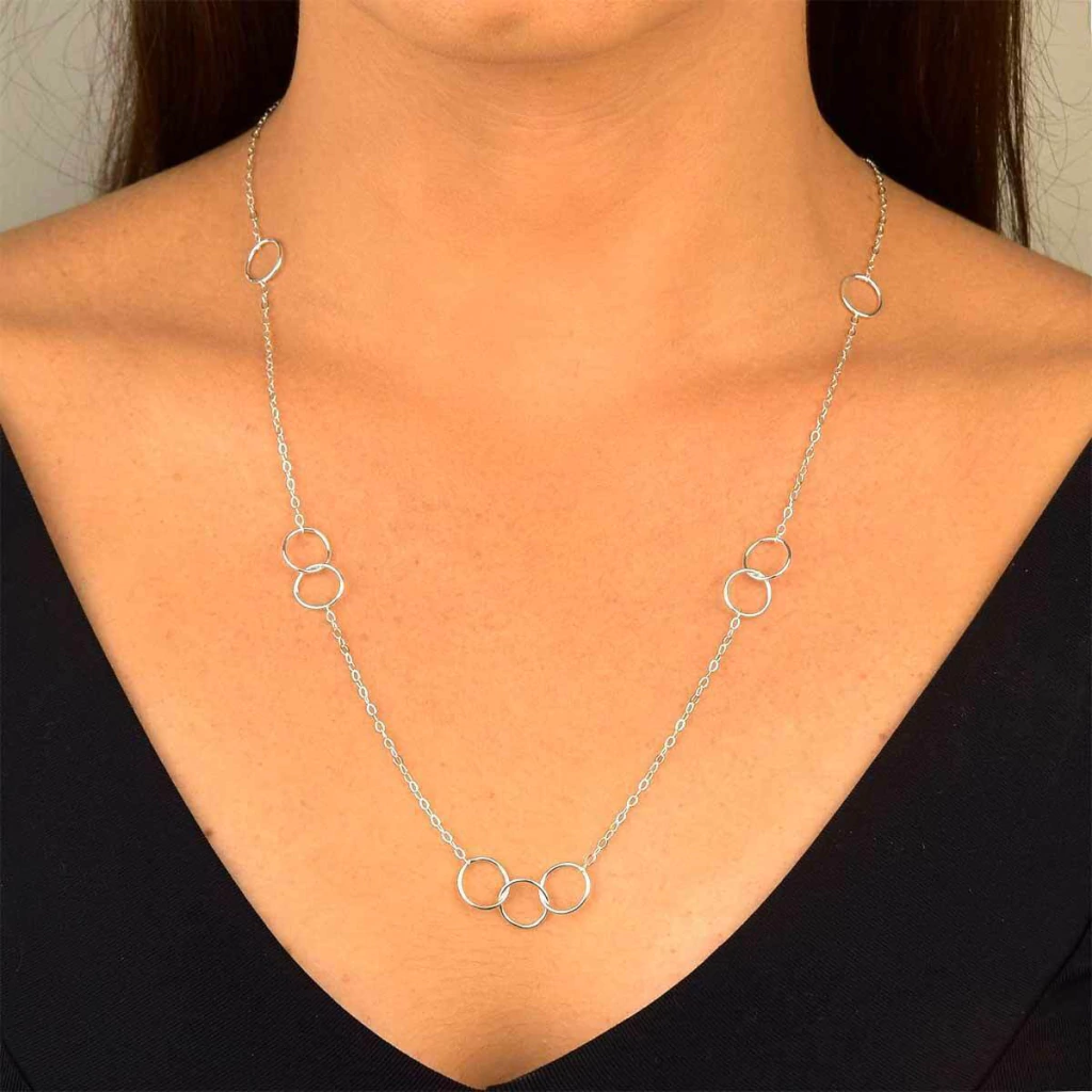 Colar Longo Três Círculos Vazados Prata 925. Esse colar é perfeito para quem valoriza elegância e gosta do estilo de colares longos. Com círculos vazados, ele traz um toque especial ao seu visual, seja no dia a dia ou em ocasiões especiais.
