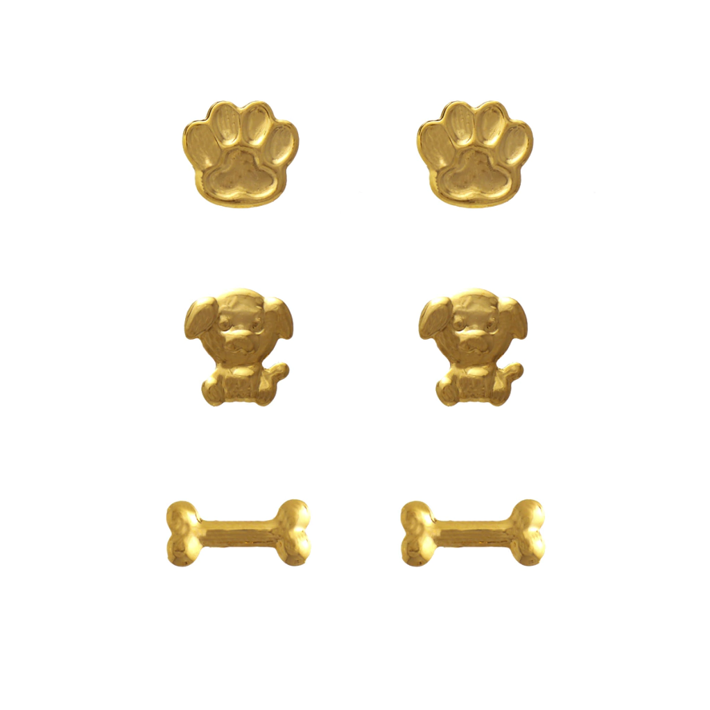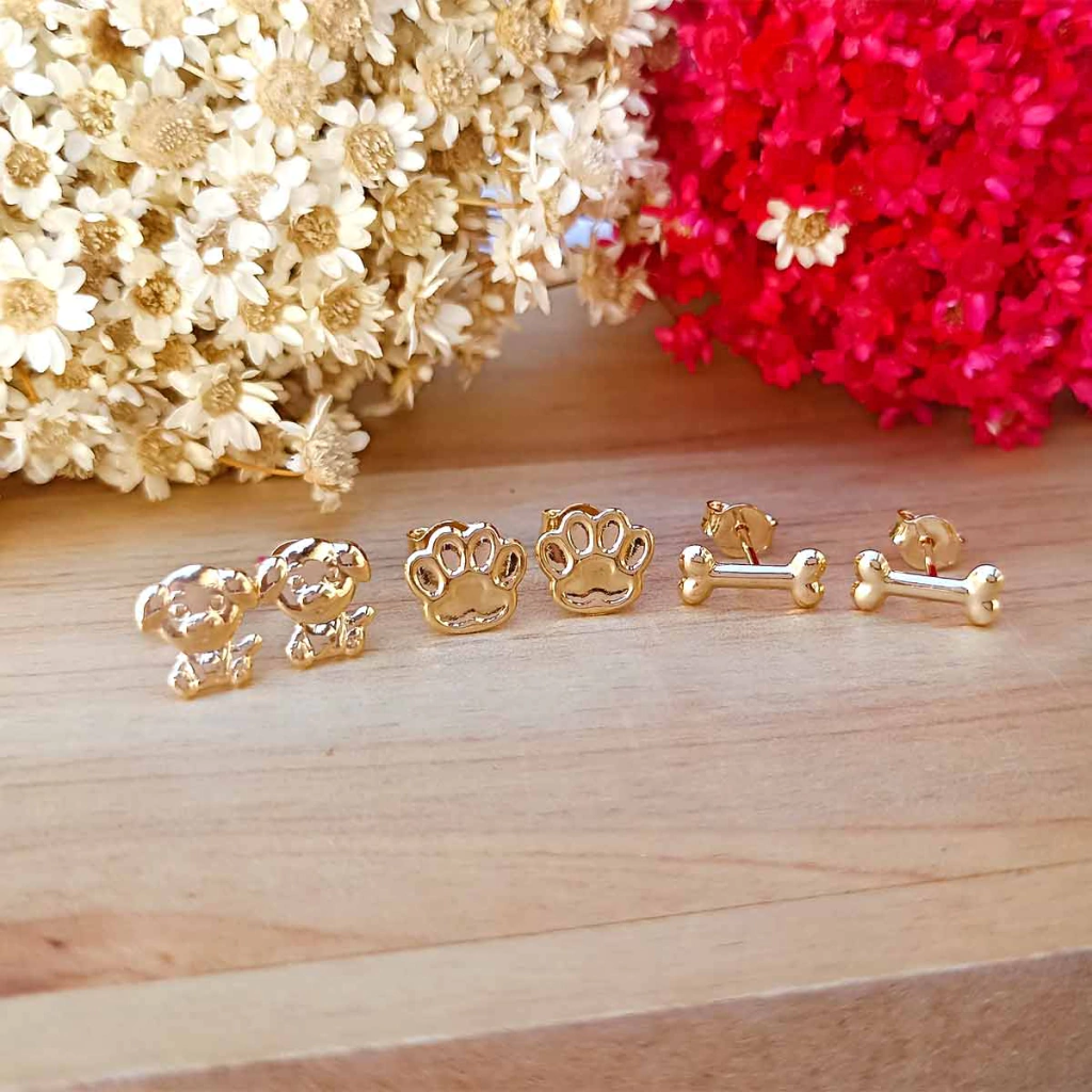 Um lindo kit de pet pra você, que adora os animaizinhos! Folheado a ouro ele possui três pares de brincos: um de patinha, um de osso e um de cachorrinho. Lindo, né? Semijoia antialérgica e com um ano de garantia.