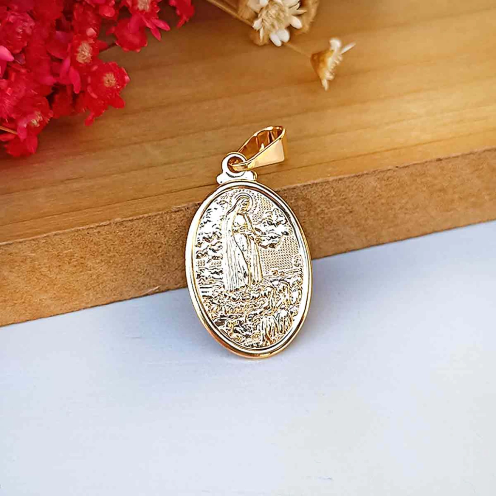 Mais um super lançamento Softjoias, um lindo pingente de Nossa Senhora de Fátima. Pode ser usado no dia a dia ou em lugares mais sofisticados. É uma semijoia toda folheada em ouro, uma peça chave para ter em seu porta-joia pois se trata de um item bem versátil. (Não acompanha a corrente).