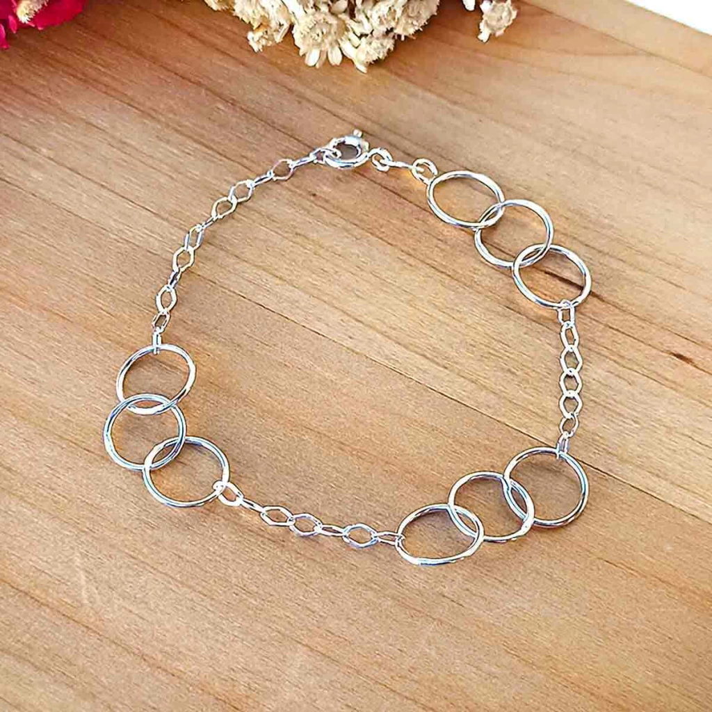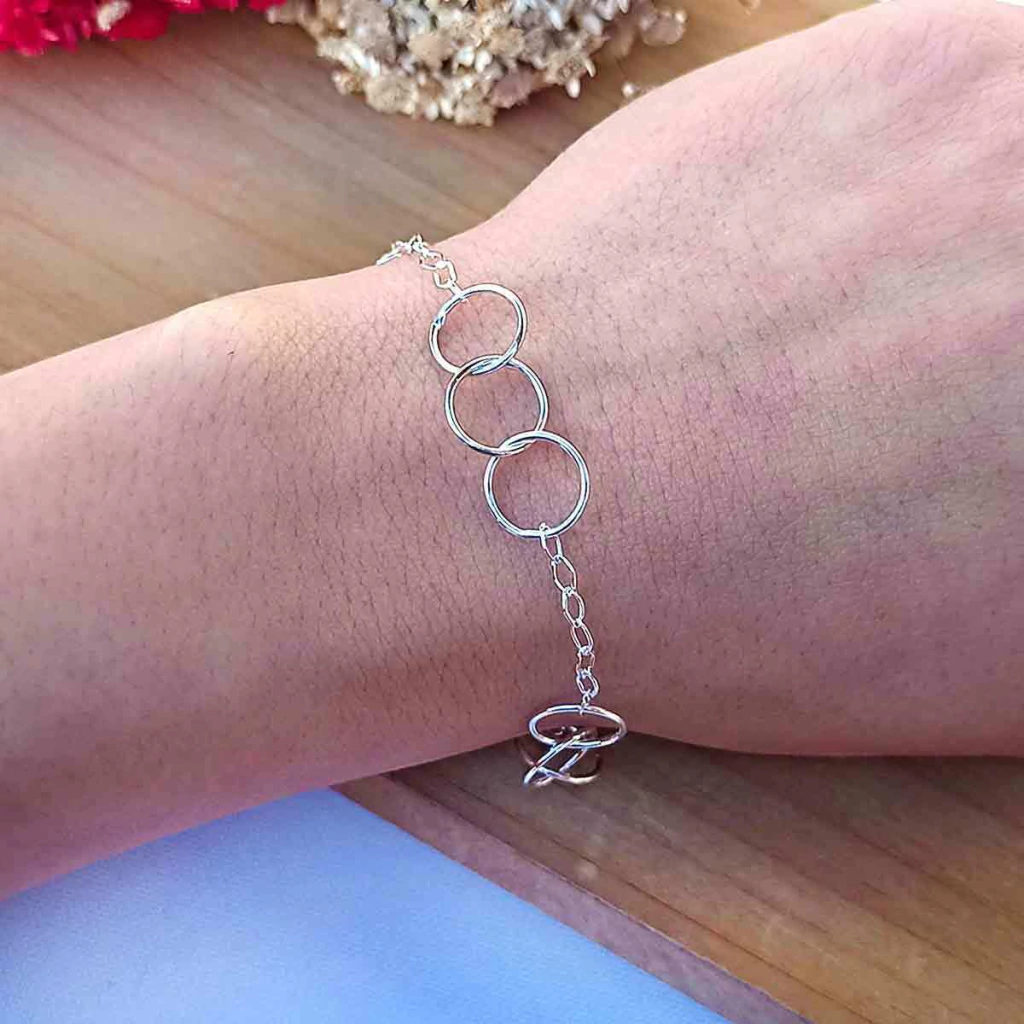 Pulseira Círculos Vazados Prata 925, Possui comprimento de 16 centímetros + 3 cm de extensor, vem com o fecho estilo boia o qual apresenta facilidade no uso, é constituida por vários elos entrelaçados e é feita com um material com excelente qualidade e durabilidade.