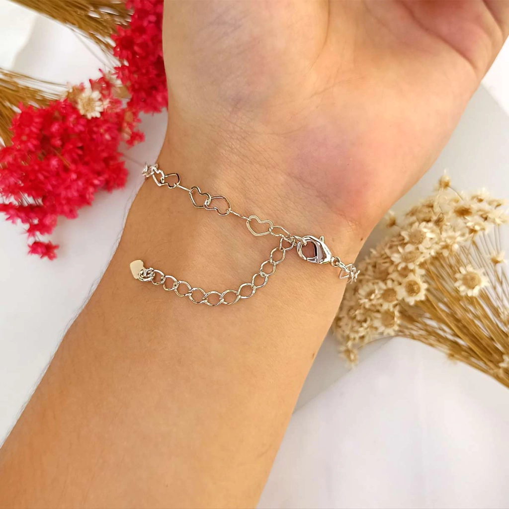 Esta pulseira é uma graça, toda folheada a ródio branco, possui seus elos em formato de coração, que transmitem muita delicadeza. Super discreta, ela pode ser usada em seu dia a dia ou em quaisquer ocasiões.