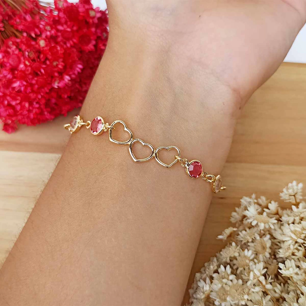 Essa pulseira é toda folheada a ouro amarelo 18K e tem uma corrente de elos português com cristais na cor rosa e branco ao lado de três corações unidos. Ideal para você que ama estar mostrando seu lado romântico! Garanta já a sua!