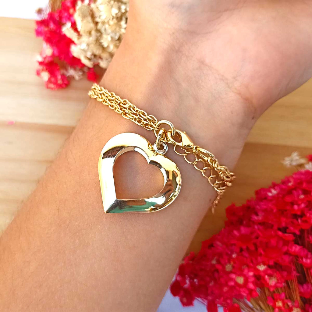 Essa pulseira com corrente dupla possui um pingente de coração vazado que é lindo! Um acessório que agrega a beleza de qualquer pessoa. Folheada em ouro e muito romântica, ela é para você estar elegante em eventos comemorativos, onde é um requisito estar bem vestida, garanta a sua!