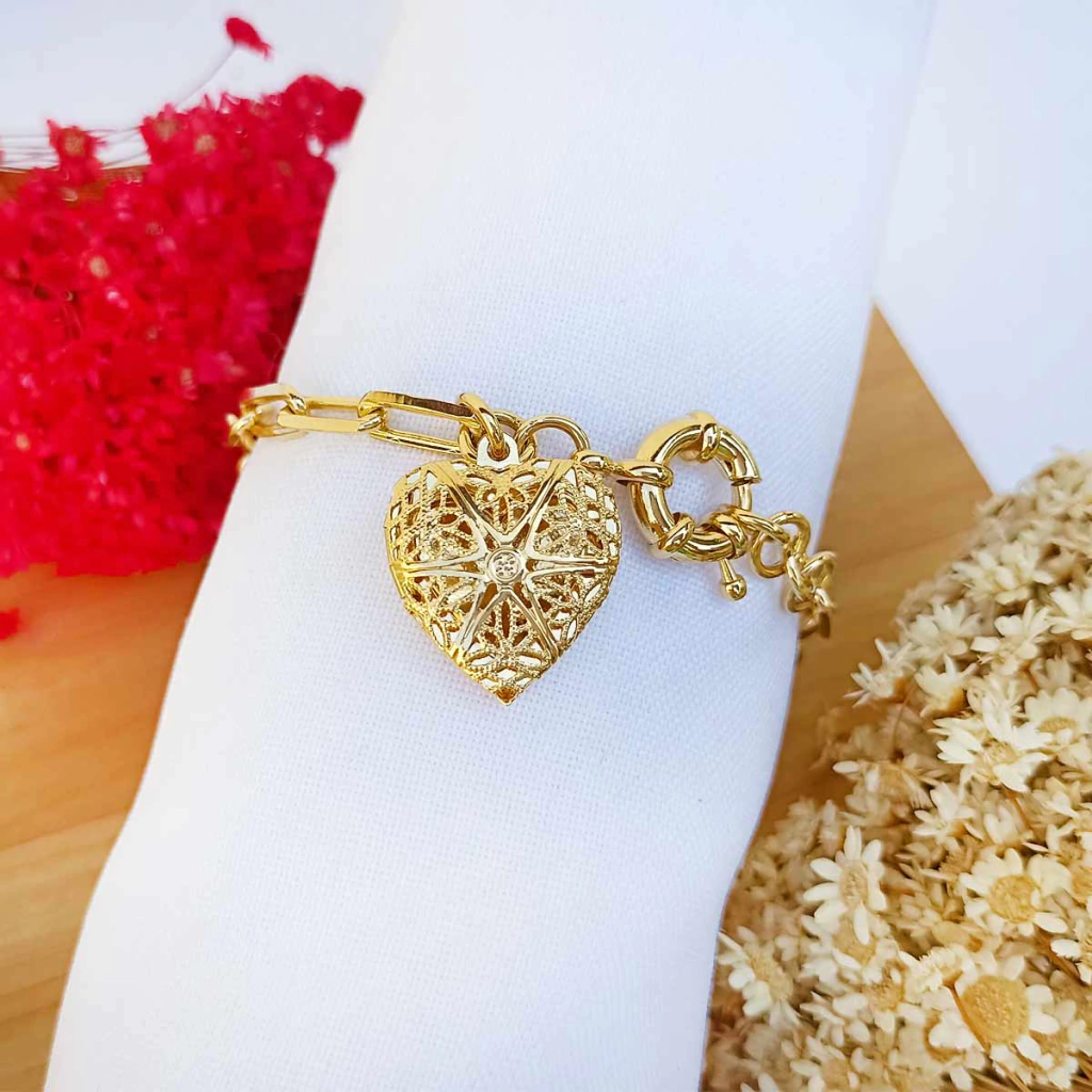 O coração tem uma firme trava "click" que não permite que nada que seja especial pra você seja perdido, mesmo que opte usá-lo no seu dia a dia. Sua corrente contrasta de forma totalmente harmônica com a delicadeza do coração todo trabalhado em detalhes vazados, dando um ar requintado a pulseira. Como acabamento, seu extensor possuí um pequeno pingente de coração chapeado que auxilia na regulagem do produto no punho. Compre já a sua!