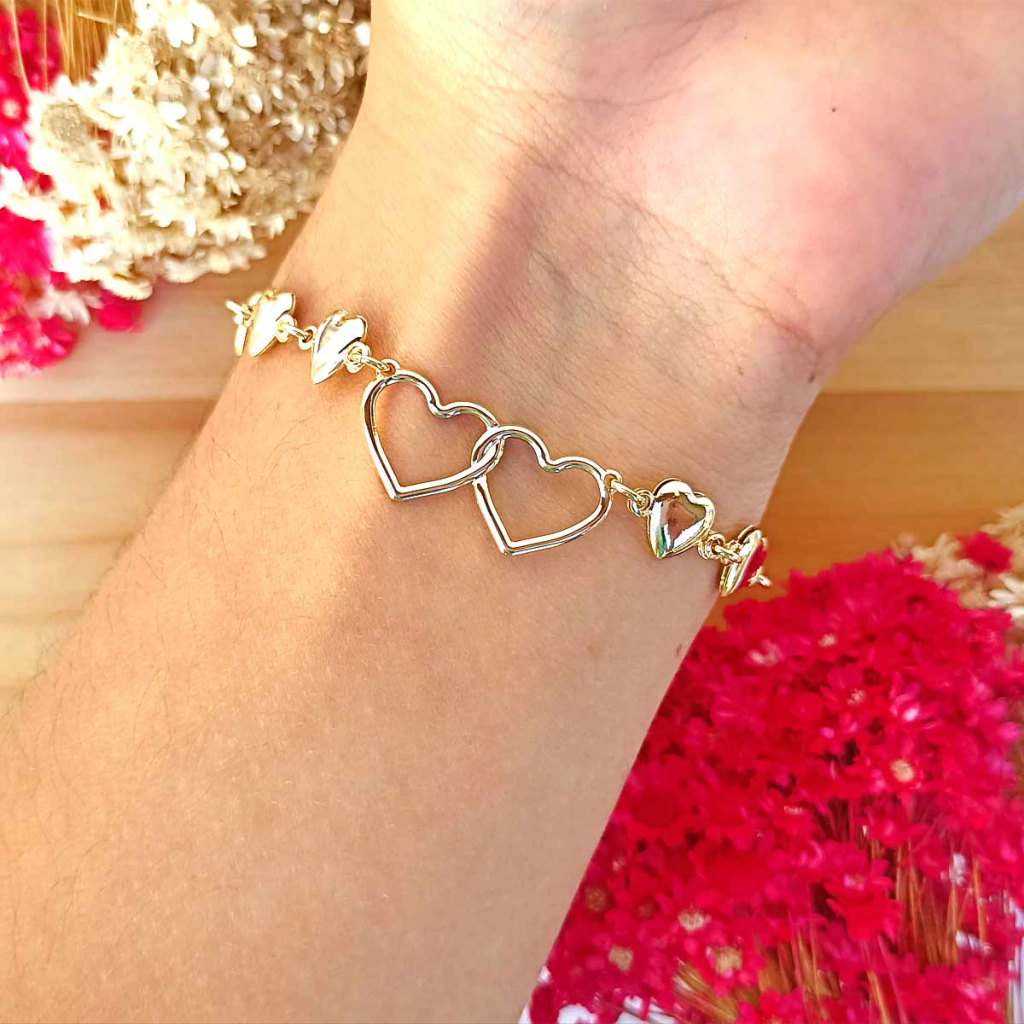 A pulseira de coração possui corações dois vazados ao centro e cheios por toda a corrente. Use e abuse desse acessório e traga uma beleza única para o seu visual! Ideal para você que tem estilo romântico e ama expressá-lo. Aproveite e garanta já a sua!