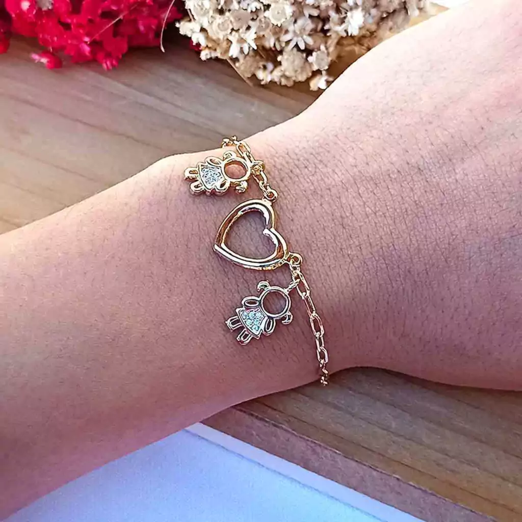 Pulseira Mãe de Duas Meninas e Coração Folheado em Ouro 18k