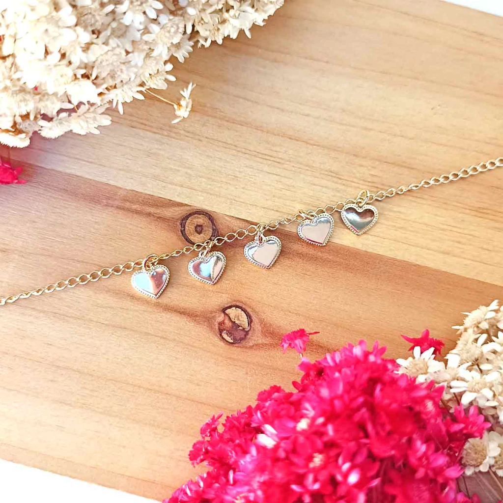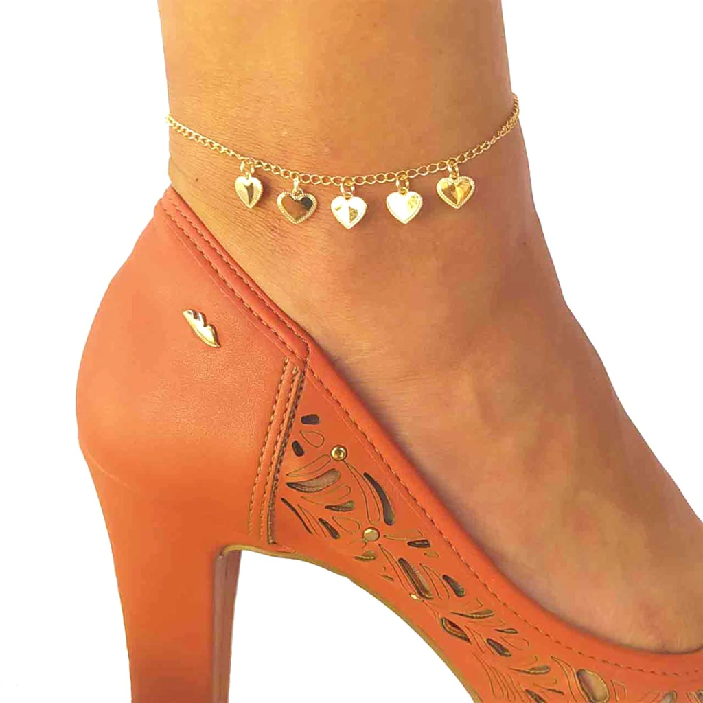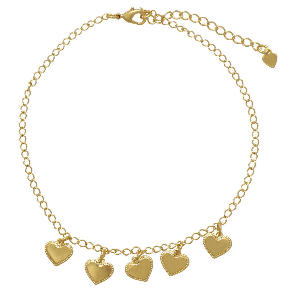 Temos aqui uma tornozeleira de coração folheada a ouro pra você! Seus cinco pequenos corações transmitem muito charme e requinte, tornando a peça ainda mais bonita, pode ser usado com outras semijoias de coração para dar aquele toque romântico em seu estilo!